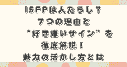 ISFPの特徴・あるある本記事では、 ISFPが恋愛で依存っぽく見える理由を心理的に整理し、 誤解を解いていきます。 恋愛で相手を大切にするほど、 距離感が分からなくなる瞬間は誰にでもある事ですよね。 ...