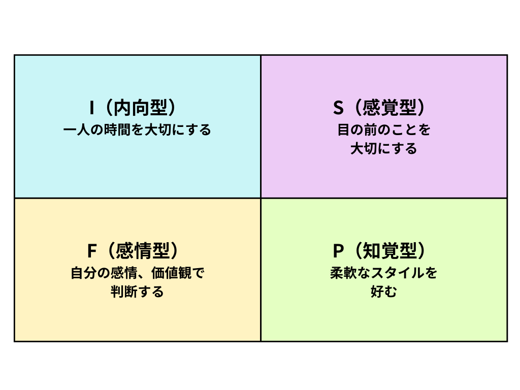 「内向型(I)」「感覚型(S)」「感情型(F)」「知覚型(P)」の組み合わせです。